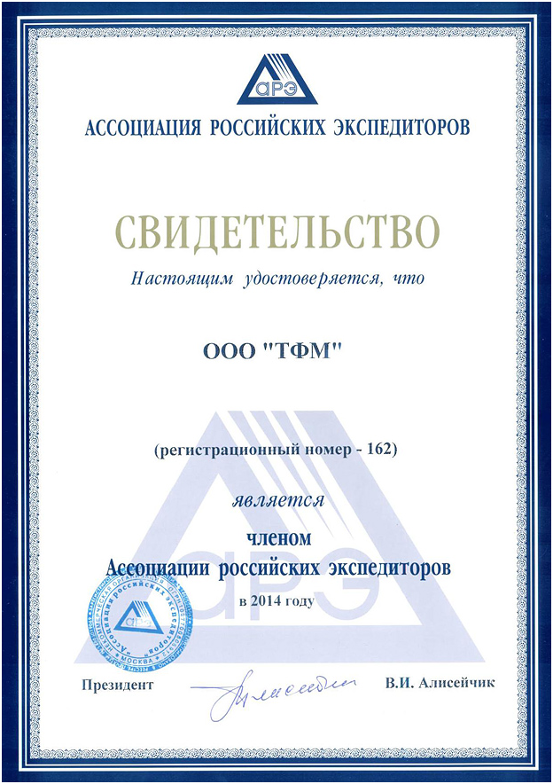 Свидетельство от АССОЦИАЦИИ РОССИЙСКИХ ЭКСПЕДИТОРОВ 2014