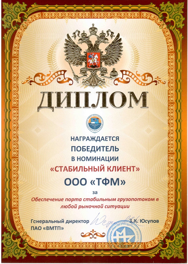 Диплом от ПАО "ВМТП