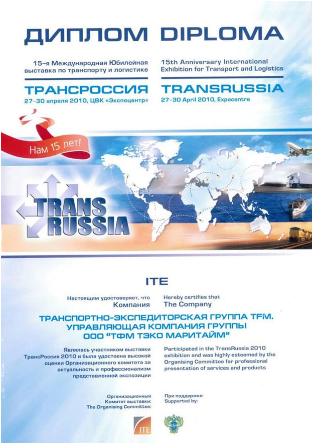 Диплом участника выставки ТРАНСРОССИЯ 2010