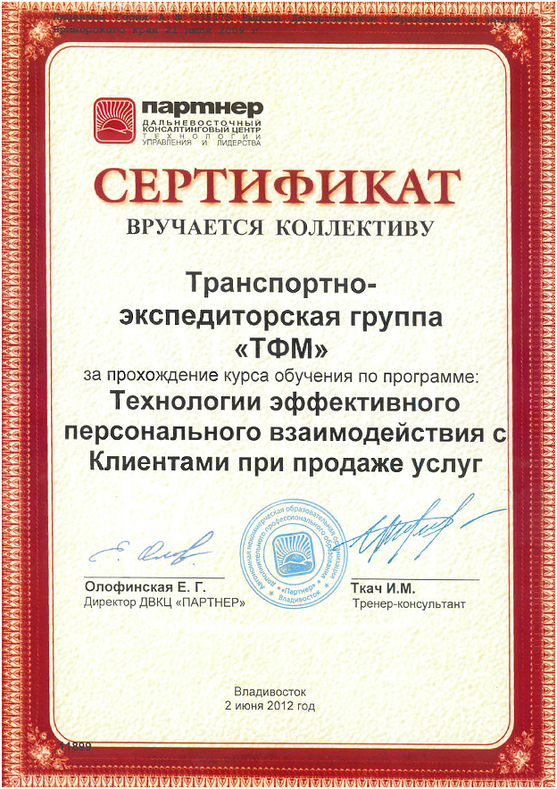 Сертификат о прохождении курса обучения коллектива
