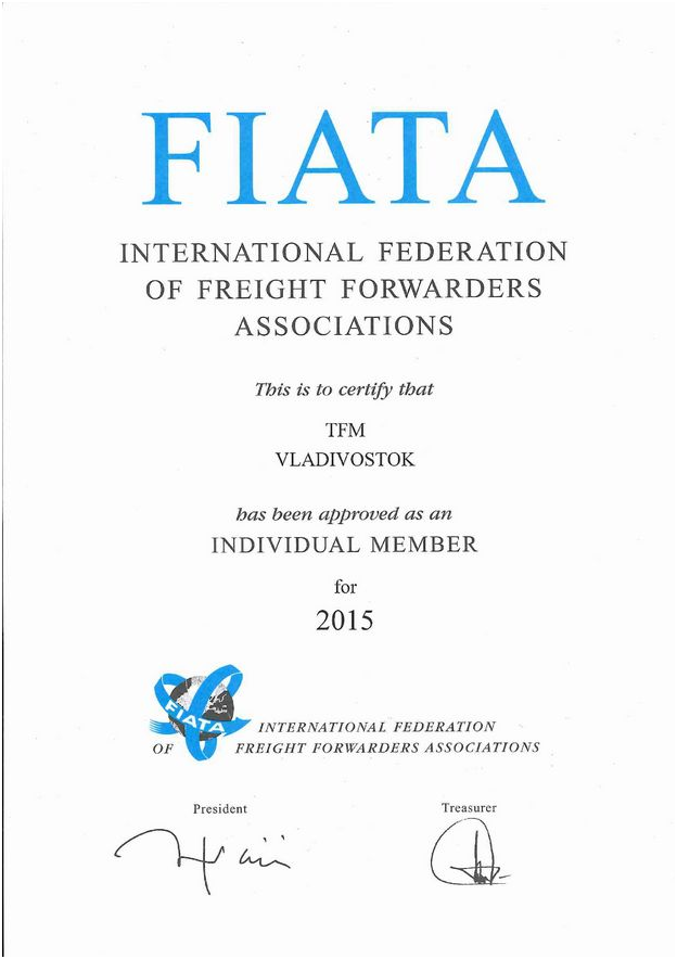 Свидетельство от INTERNATIONAL FEDERATION OF FREIGHT FORWARDERS ASSOCIATIONS 2015