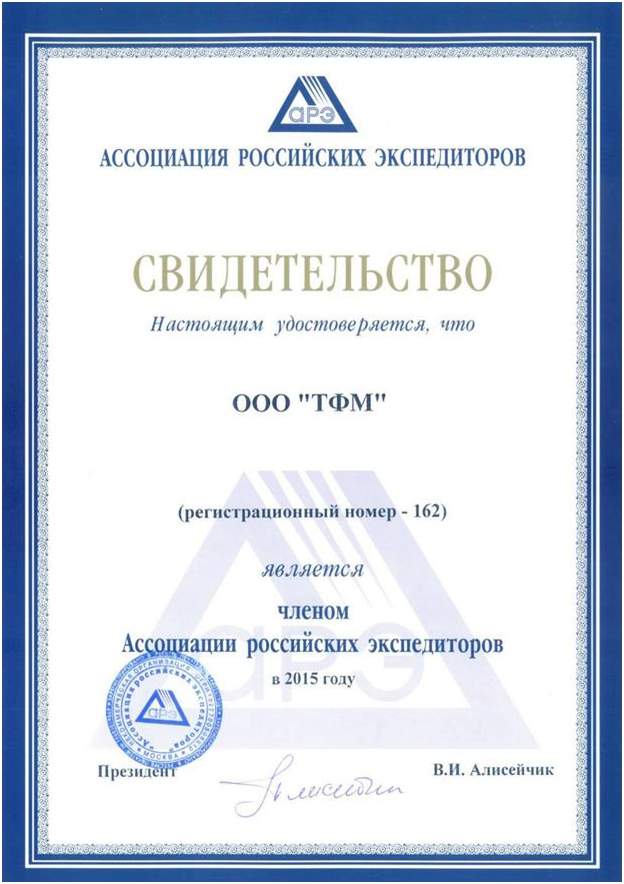 Свидетельство от АССОЦИАЦИИ РОССИЙСКИХ ЭКСПЕДИТОРОВ 2015