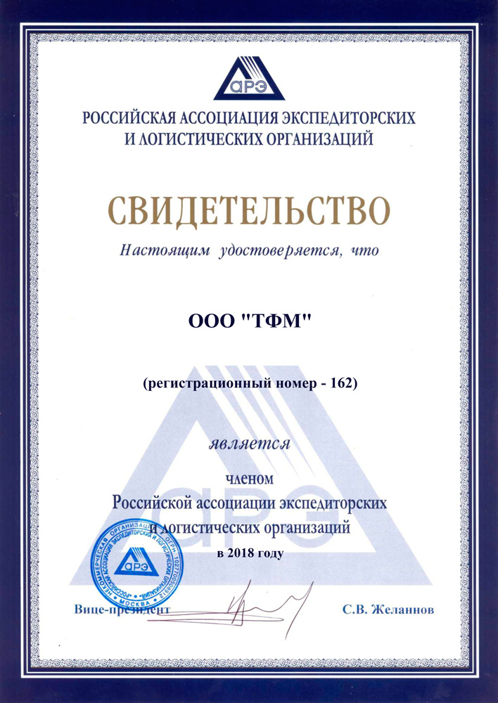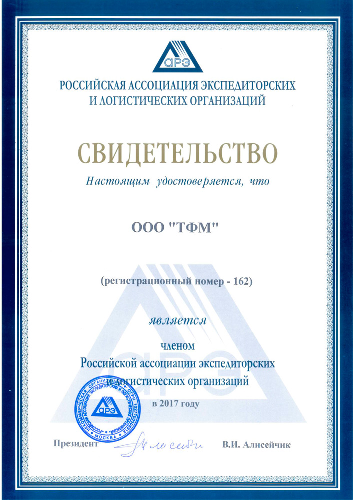 Свидетельство от АССОЦИАЦИИ РОССИЙСКИХ ЭКСПЕДИТОРОВ 2017