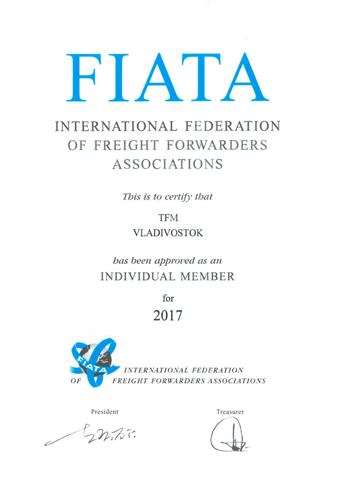 Свидетельство от INTERNATIONAL FEDERATION OF FREIGHT FORWARDERS ASSOCIATIONS 2017