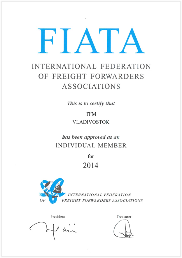 Свидетельство от INTERNATIONAL FEDERATION OF FREIGHT FORWARDERS ASSOCIATIONS 2014